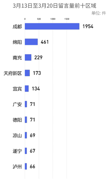 各市州及天府新区的留言量分别为:成都1954件、绵阳461件、南充229件、天府新区173件、宜宾134件、广安71件、德阳71件、凉山69件、遂宁67件、泸州66件、达州63件、广元54件、眉山46件、自贡45件、乐山43件、巴中40件、内江36件、资阳28件、攀枝花22件、甘孜13件、阿坝12件、雅安10件。