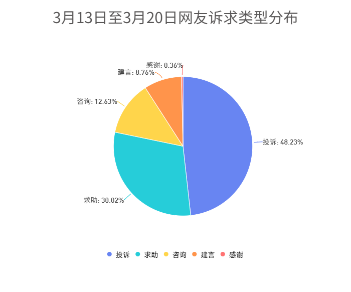留言类型中投诉类最多,共1894件,占比48.23%;第二为求助类1179件,占比30.02%;第三为咨询类496件,占比12.63%。此外,建言类344件,感谢类14件。