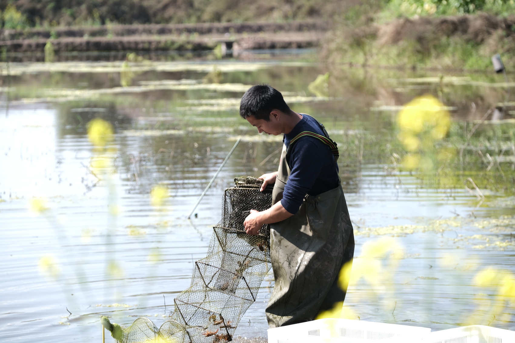 宜宾市南溪区仙临镇,养殖户杨海的小龙虾养殖基地内,虾农正在捕虾。(受访者供图)
