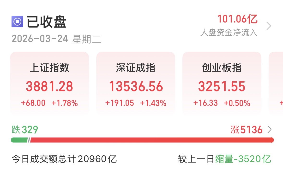 3月24日,A股三大指数集体上涨。截至收盘,沪指涨1.78%,收报3881.28点;深证成指涨1.43%,收报13536.56点;创业板指涨0.50%,收报3251.55点。全市场成交额20960亿,较昨日缩量3520亿。