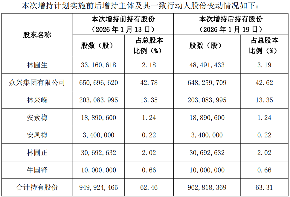 从股权结构来看,大中矿业具有鲜明的家族企业特征。公司控股股东为众兴集团有限公司,持股比例42.62%,实际控制人为林来嵘、安素梅夫妇,二人合计持有众兴集团100%股权;此外,林来嵘直接持有大中矿业13.25%股份,安素梅直接持有1.24%股份,其子林圃生、林圃正分别持股3.19%、2.00%。通过一致行动人安凤梅(持股0.22%)、牛国锋(持股0.66%),林来嵘家族合计控制大中矿业63.31%股份,股权集中度较高,家族对公司的掌控力稳固。