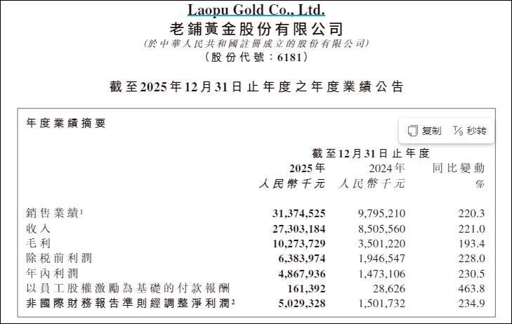 3月23日,黄金一片大跌声中,老铺黄金发布了2025年度业绩报告。