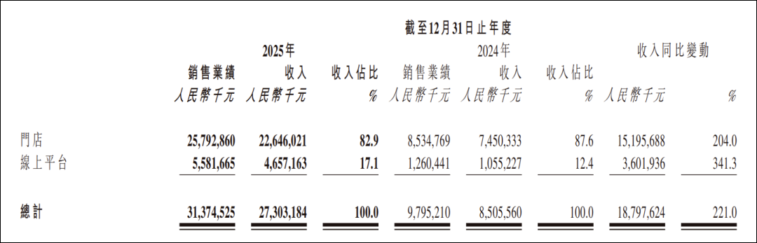与此同时,线上平台是老铺黄金销售渠道的有力补充,2025年线上平台产生的营收约为46.57亿元,同比大涨341.3%,占总营收约17.1%(2024年占比为12.4%)。