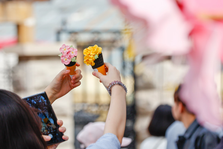 在天津市五大道风景区,游客手举海棠花造型雪糕拍照留影。新华社发(杜鹏辉 摄)
