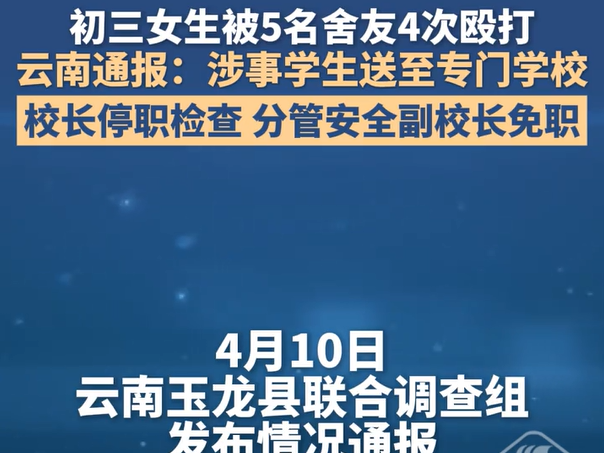 经查,该段视频反映的情况发生于2025年12月11日中午放学后,大理市一初级中学4名学生在校外因口角矛盾对1名女生实施打骂行为。当天下午上课期间,学校老师发现该女生状态不佳,向其询问后,该女生陈述被同校学生在校外打骂。根据陈述,学校老师对涉事学生进行了批评教育并责令当场道歉,该女生接受了道歉。事后学校未通知涉事学生家长,也未报告主管部门。
