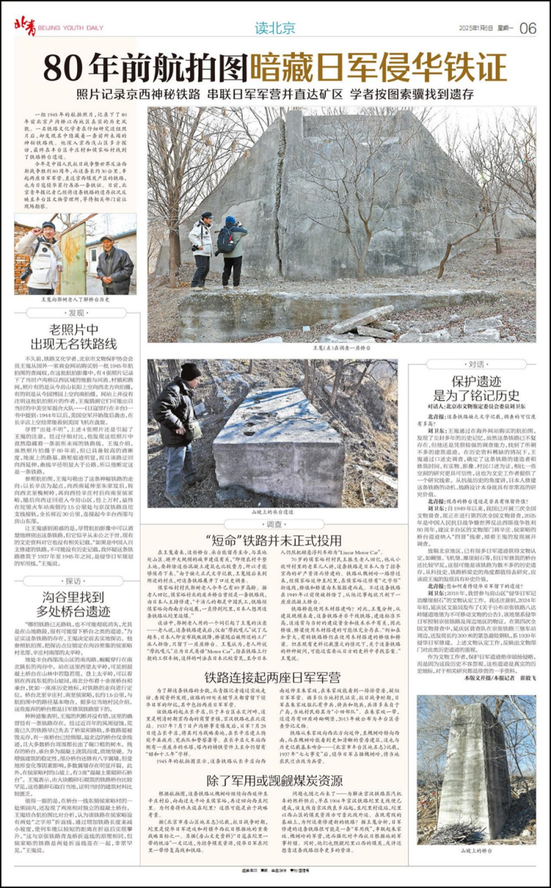 这位工作人员还提到,一并纳入第四次全国文物普查线索的还有太平岭的桥台建筑群。2025年1月6日,《北京青年报》以“80年前航拍图暗藏日军侵华铁证”为题,报道丰台区西部太平岭发现疑似日军铁路桥台建筑群一事。而该建筑群也是由王嵬依据航拍照片的线索,实地探访后所发现。