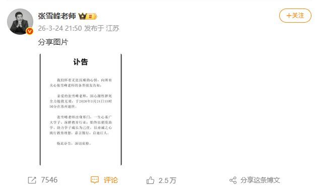 3月24日晚,@张雪峰老师 微博发布讣告: