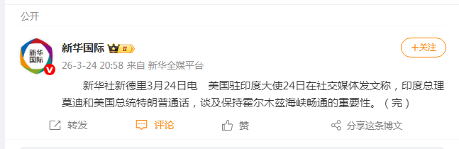美国驻印度大使24日在社交媒体发文称,印度总理莫迪和美国总统特朗普通话,谈及保持霍尔木兹海峡畅通的重要性。