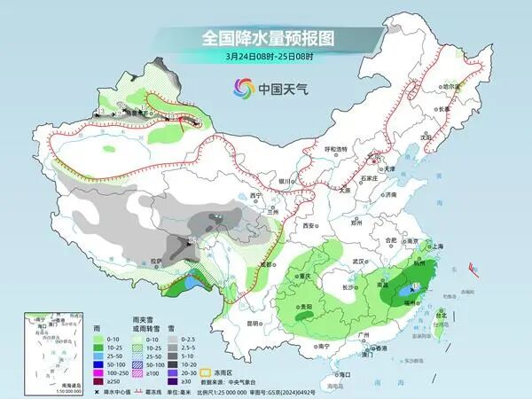 未来三天,南方大范围阴雨天气持续,降水强度总体有所减弱,湖南、江西、福建等地部分地区有大雨或暴雨。此外,青藏高原、新疆部分地区今明天降雪将增多、增强,部分地区有大到暴雪。