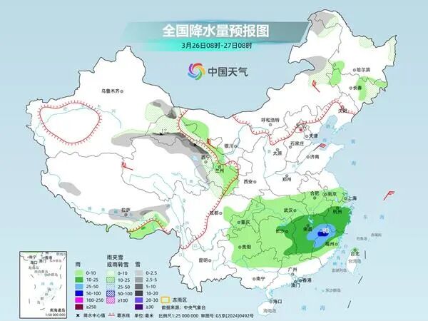 后天,新疆东部、西藏东部、甘肃河西地区、青海北部等地部分地区有小到中雪或雨夹雪,其中,青海北部、甘肃河西等地局地大到暴雪。江南中东部等地部分地区有中到大雨,其中,福建西北部等地部分地区有暴雨。