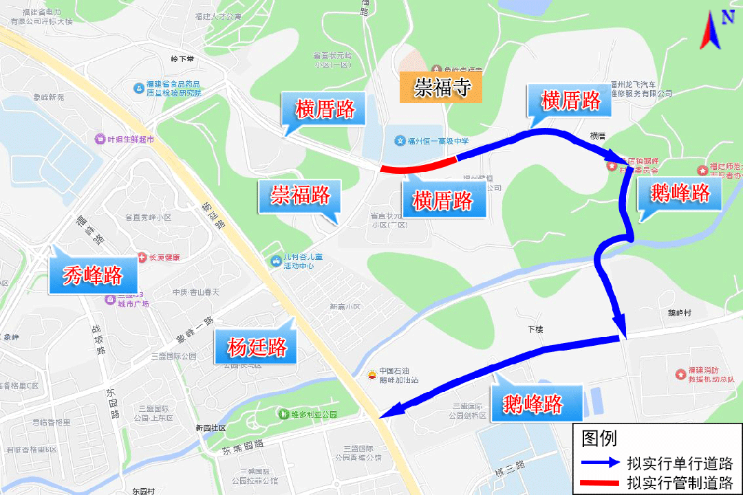 (三)鹅峰路(北起鹅峰路横厝路口,南至鹅峰路杨廷路口)实行机动车由横厝路往杨廷路方向单向通行。