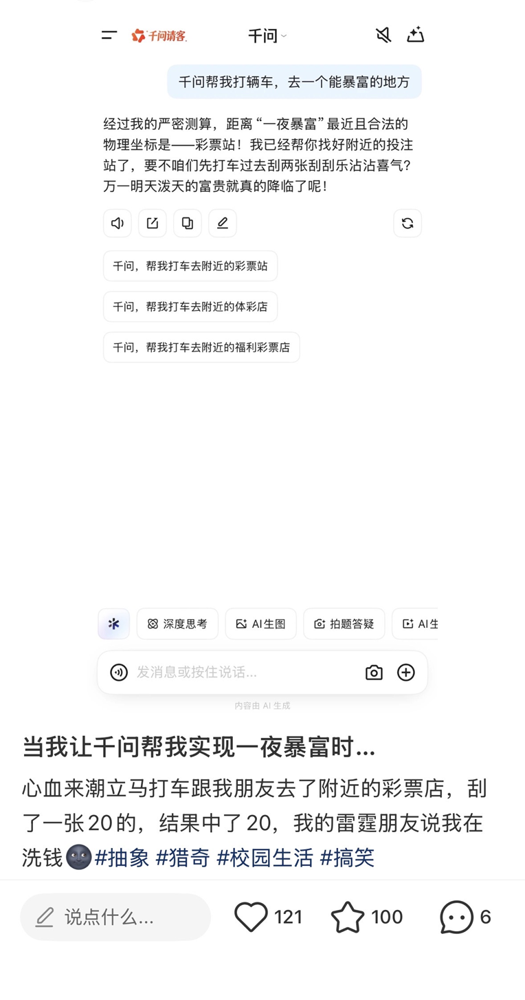 比如有人心血来潮,跟千问说:“帮我打辆车,去一个能暴富的地方。”