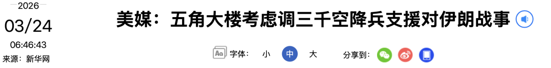 美媒:五角大楼考虑调三千空降兵支援对伊朗战事