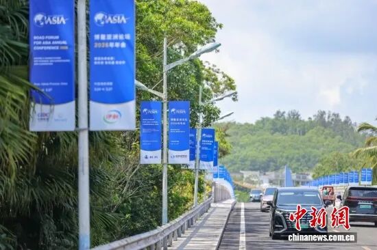 图为博鳌培兰桥道路两侧,博鳌亚洲论坛2026年年会道旗整齐排列。中新社记者 骆云飞 摄