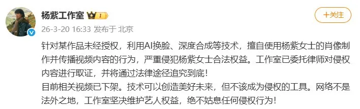 有网友反映某平台AI短剧使用了杨紫的脸。3月20日下午,杨紫工作室发文回应称,某作品未经授权,利用AI换脸、深度合成等技术,擅自使用杨紫的肖像制作并传播视频内容的行为,严重侵犯杨紫合法权益。目前,杨紫工作室已委托律师对侵权内容进行取证,并将通过法律途径追究到底。(此前报道)