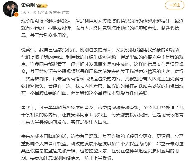 3月23日,霍启刚在个人社交账号上发文,称自己的形象遭到AI盗用。