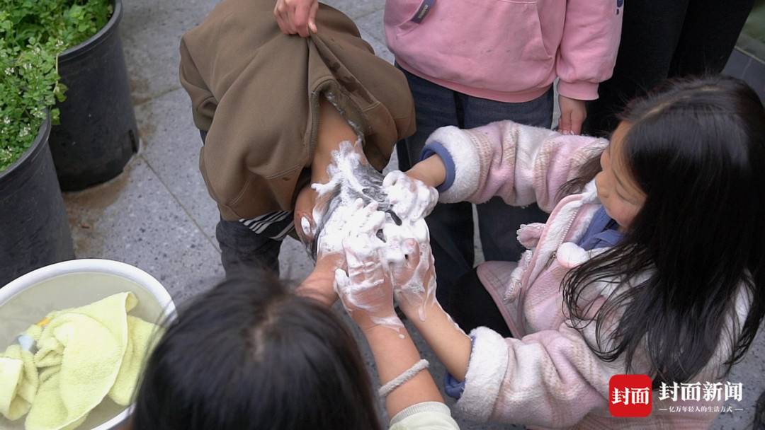 孩子们互相帮忙洗头。