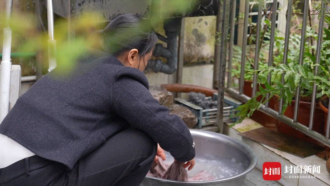 张蓉蹲在地上手洗孩子们的衣服,她说洗衣机洗不掉的污渍,她都要再手洗一遍。