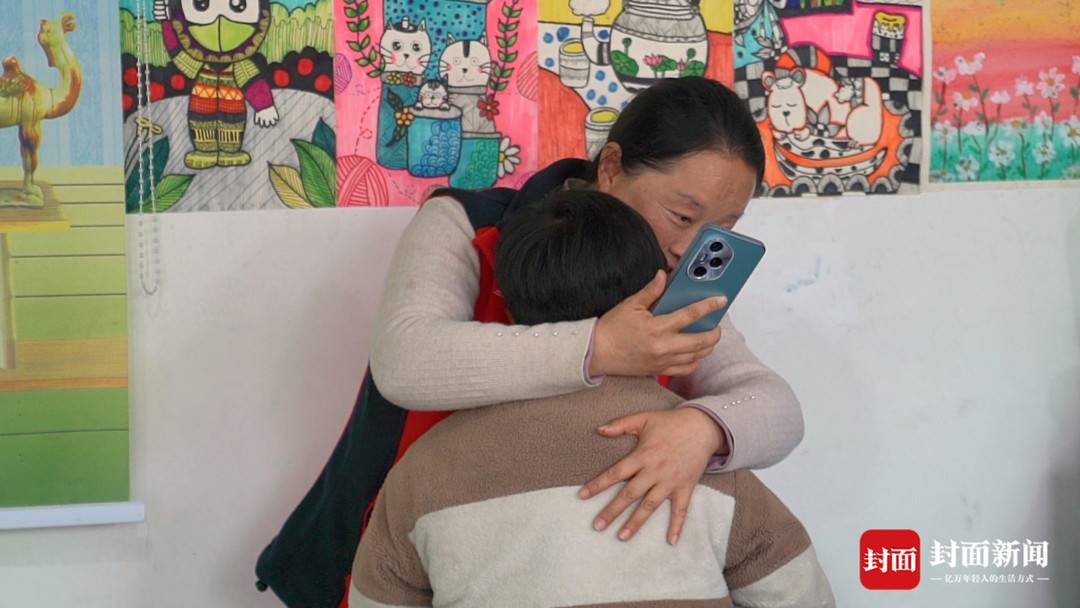 孩子与妈妈视频通话时激动流泪,张蓉将孩子抱在怀里安慰。
