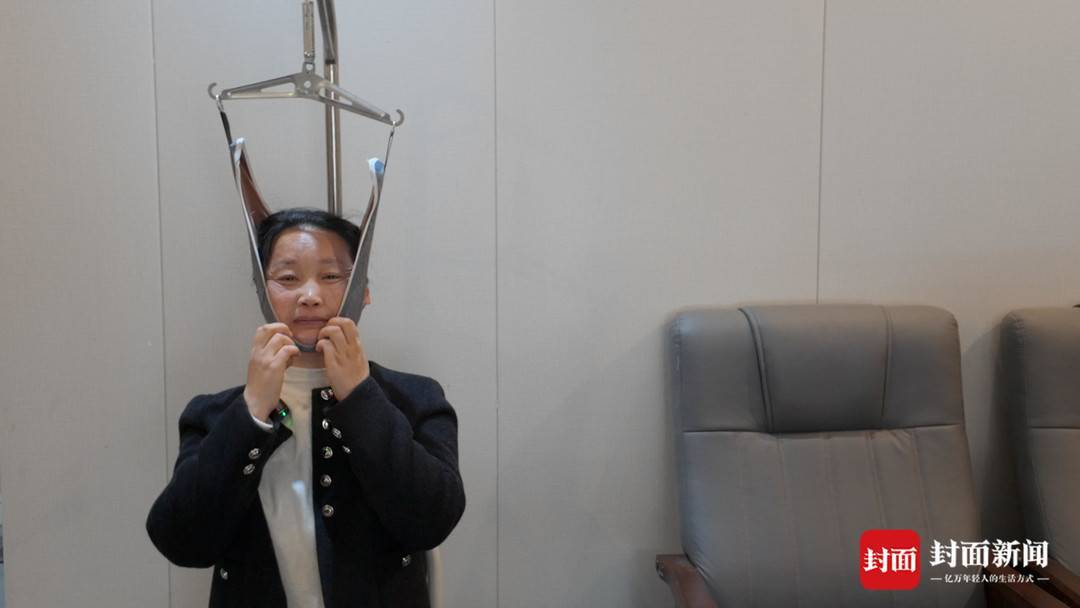 长期操劳让张蓉患了颈椎病,她会在空闲时牵引颈椎,每次牵引重量要达到15公斤。