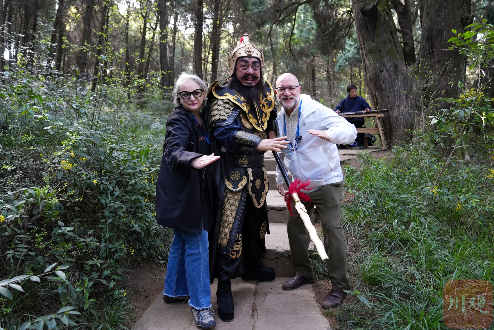 美国嘉宾在翠云廊和扮演张飞的演员合影。