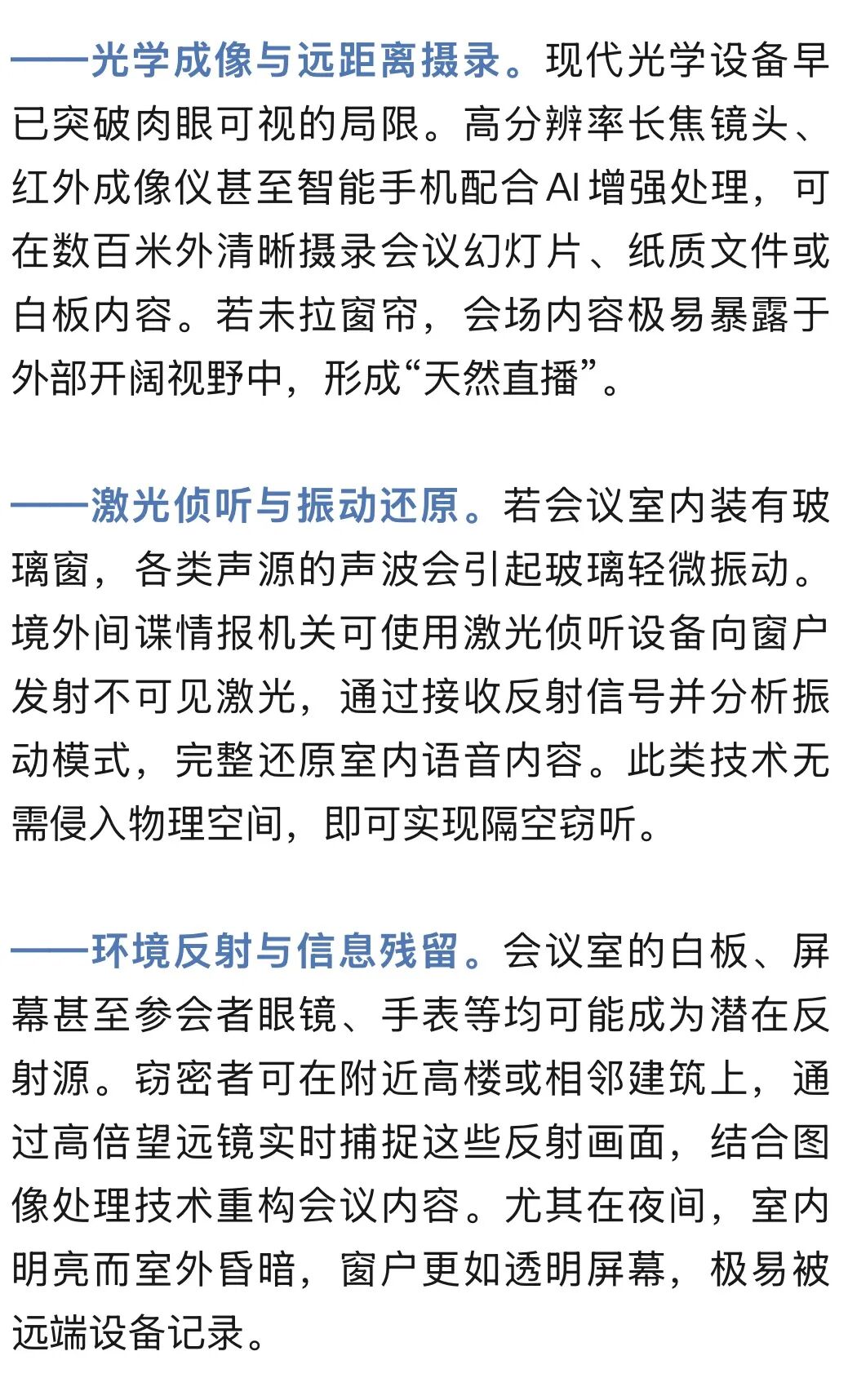 拉上窗帘,这个简单的动作究竟是为了防御什么呢?它防的绝不是无心之人的随意一瞥,而是越来越先进的远程无接触窃密技术手段。今天,国安部门为大家揭秘几种常见的窃密技术手段与防护方法,希望大家提高警惕,筑牢安全防线。