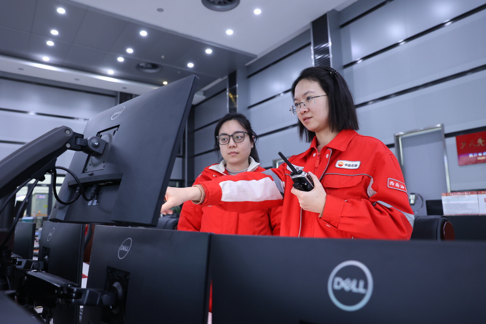 何璐汐(右)与同事在中控室查看参数
