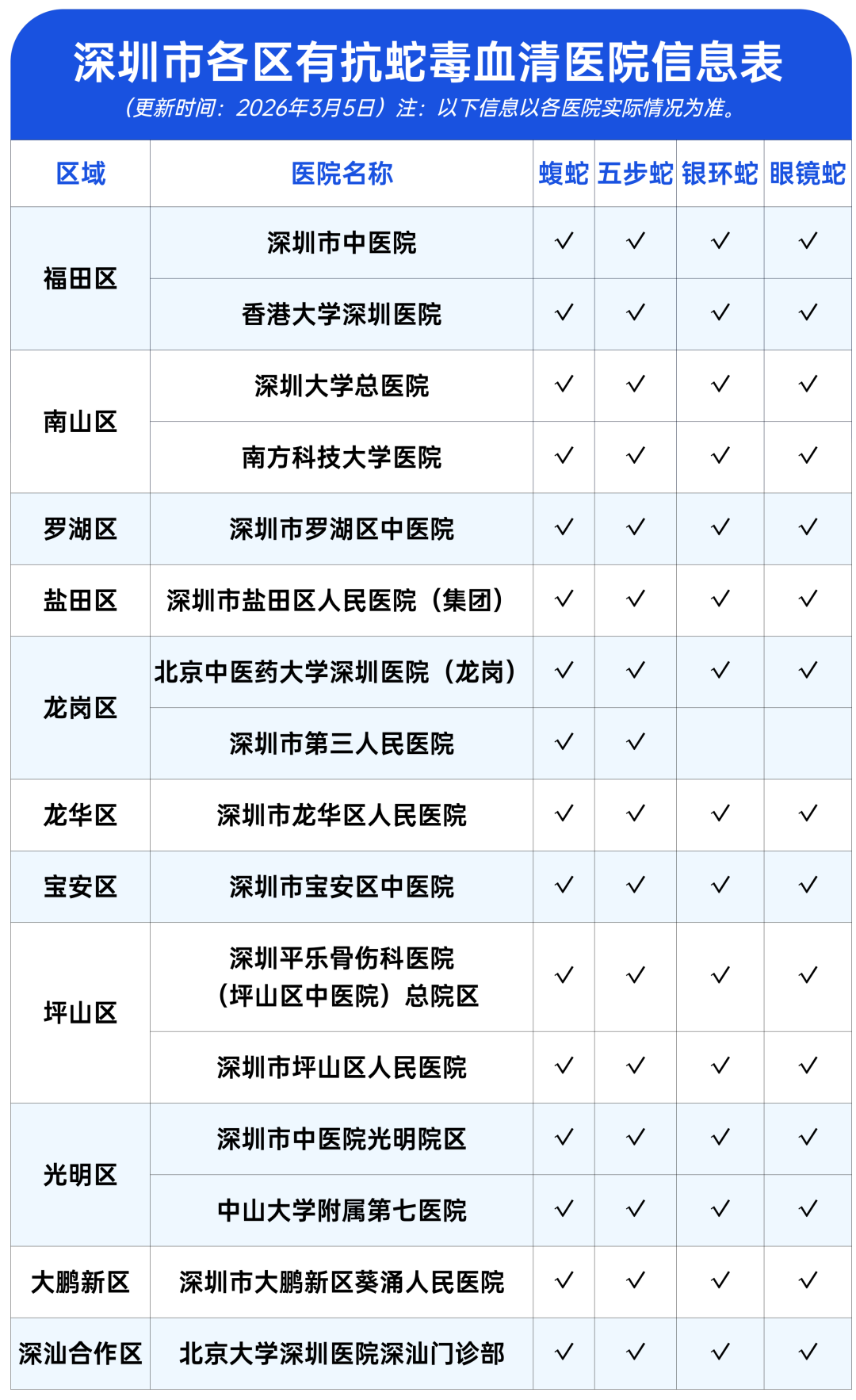 深圳市急救中心对全市(含深汕合作区)有抗蛇毒血清的医院信息进行了更新请大家收好啦