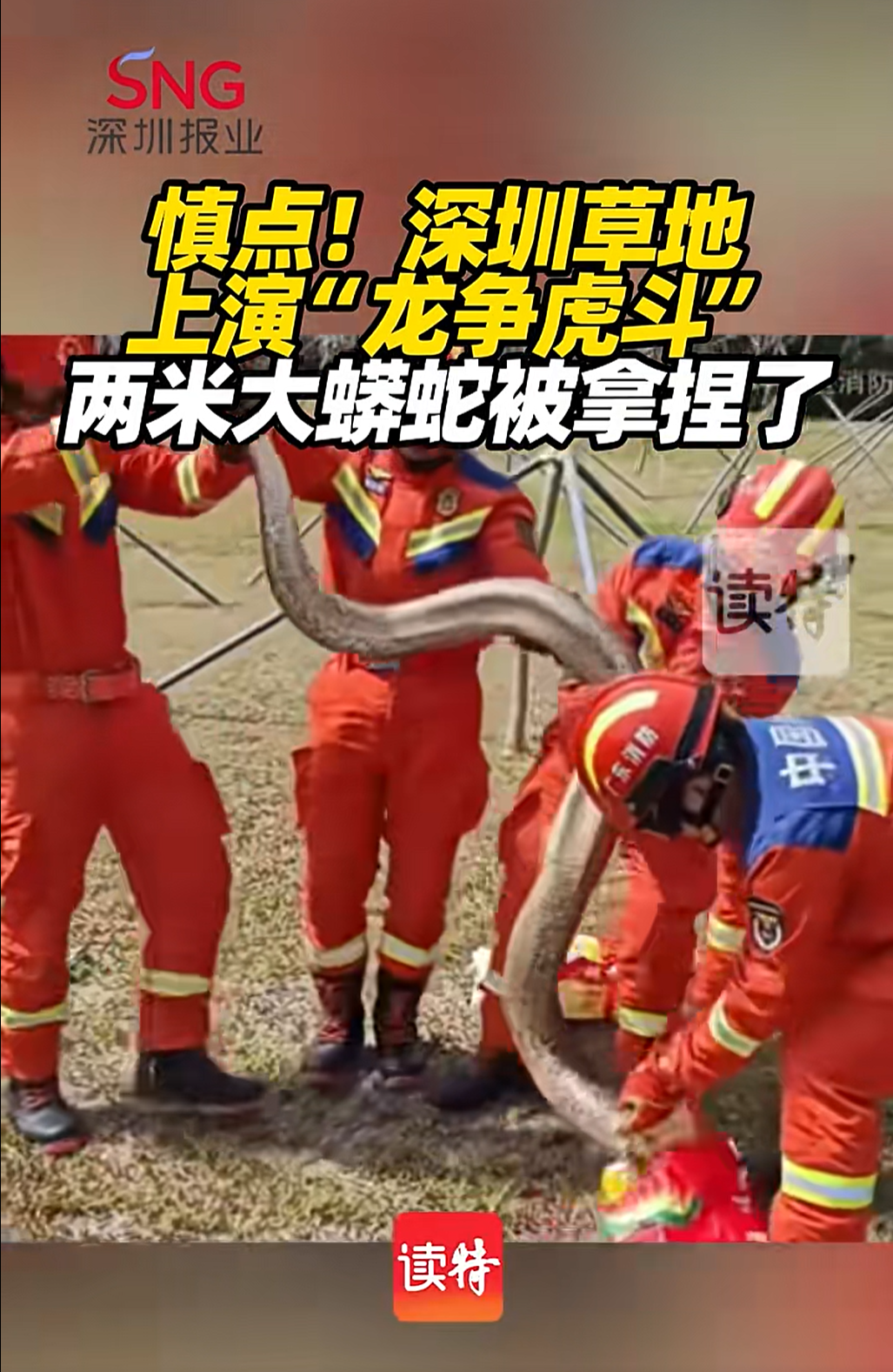 近日深圳坪山龙田街道一处草地出现一条超两米的蟒蛇深圳消防员到现场对其进行“抓捕”最后移交给野生动物保护站处置