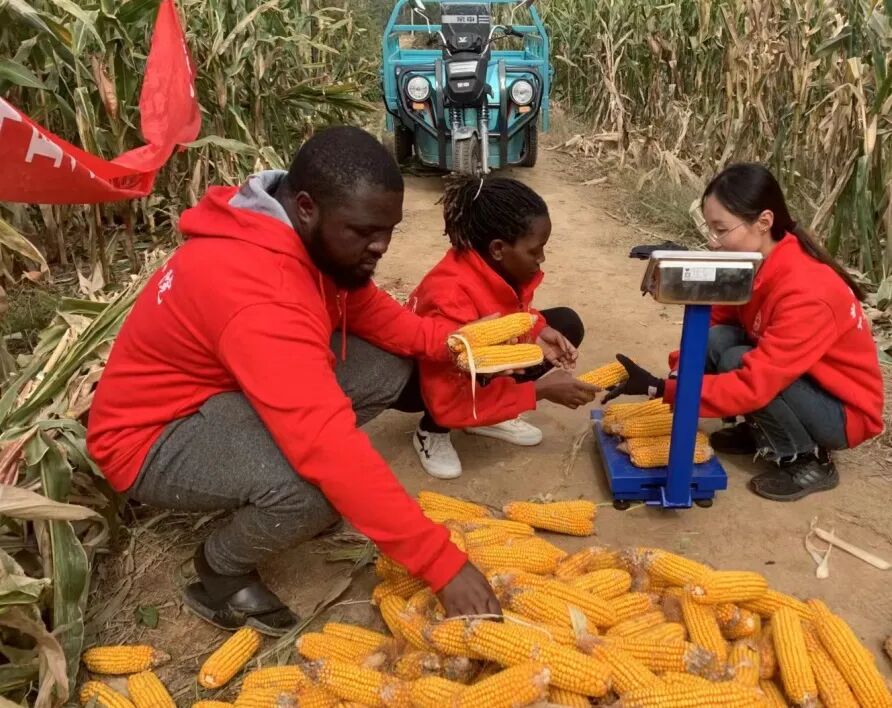 在河北曲周县试验田,塞姆(左一)和同学一起给玉米称重。焦小强供图