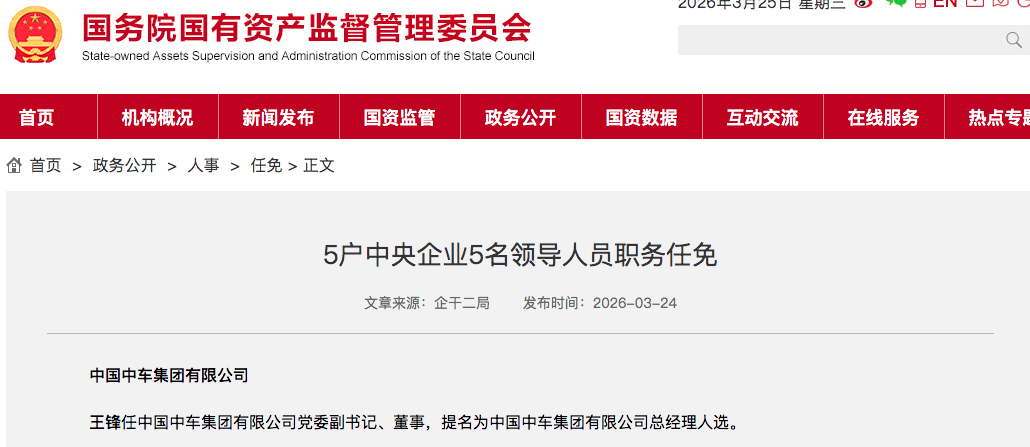 国资委官网3月24日消息,5户中央企业5名领导人员职务任免,涉及轨道交通装备央企中国中车: