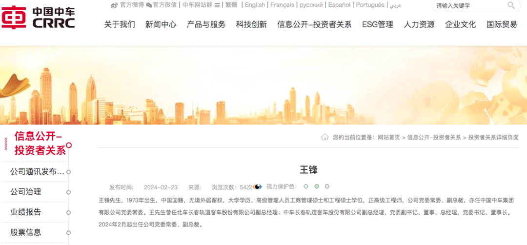 2024年2月起出任中国中车党委常委、股份公司副总裁。
