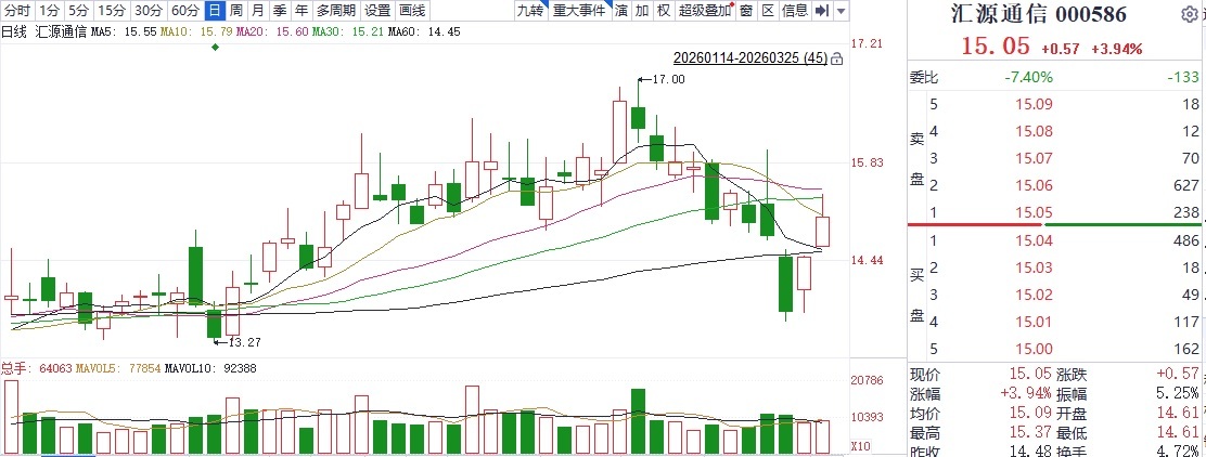 二级市场上,汇源通信出现探底回升走势,3月25日收盘大涨3.94%,报收15.05元。