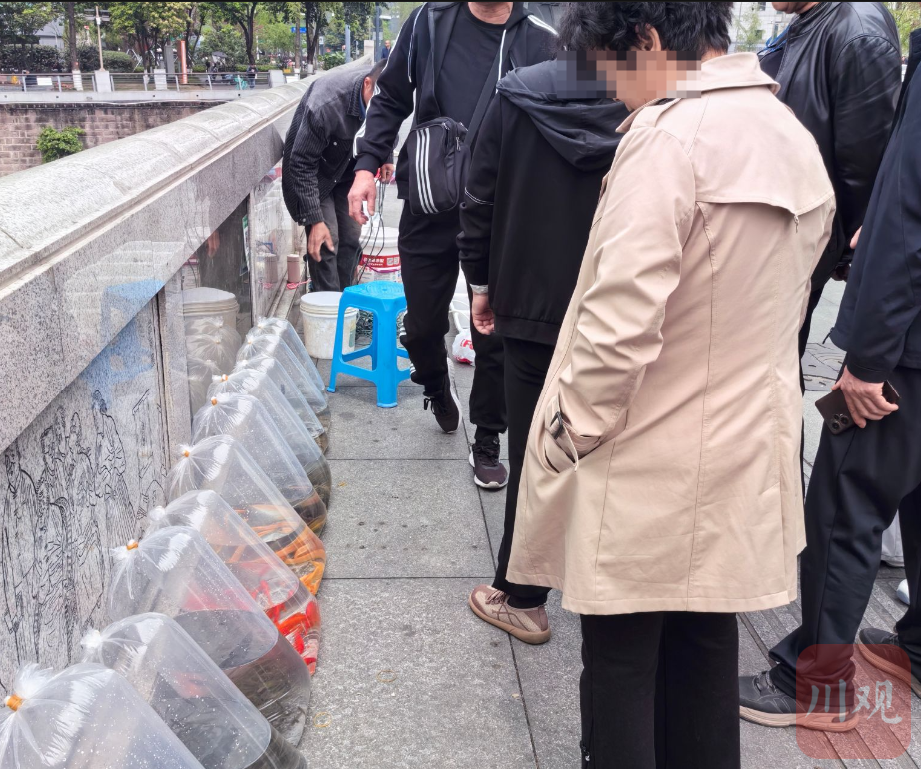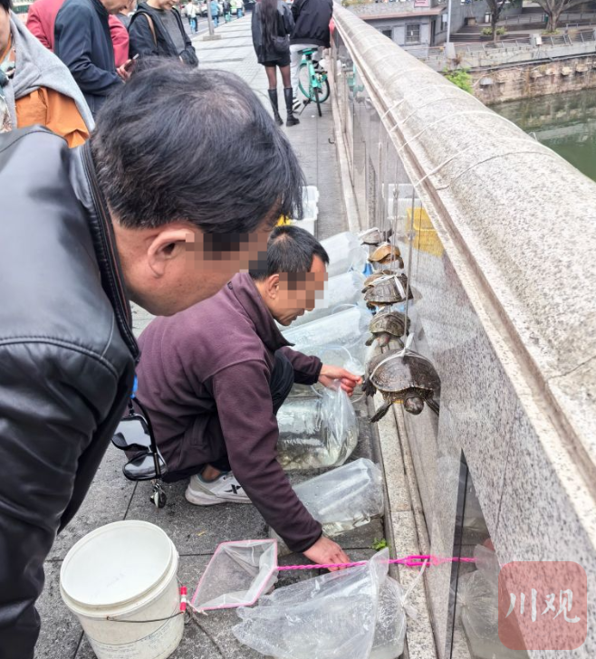 上午10时许,一群来成都旅游的游客来到桥头,以100元的价格从一位商贩处购买了一袋鱼苗,委托商贩代其现场放生。