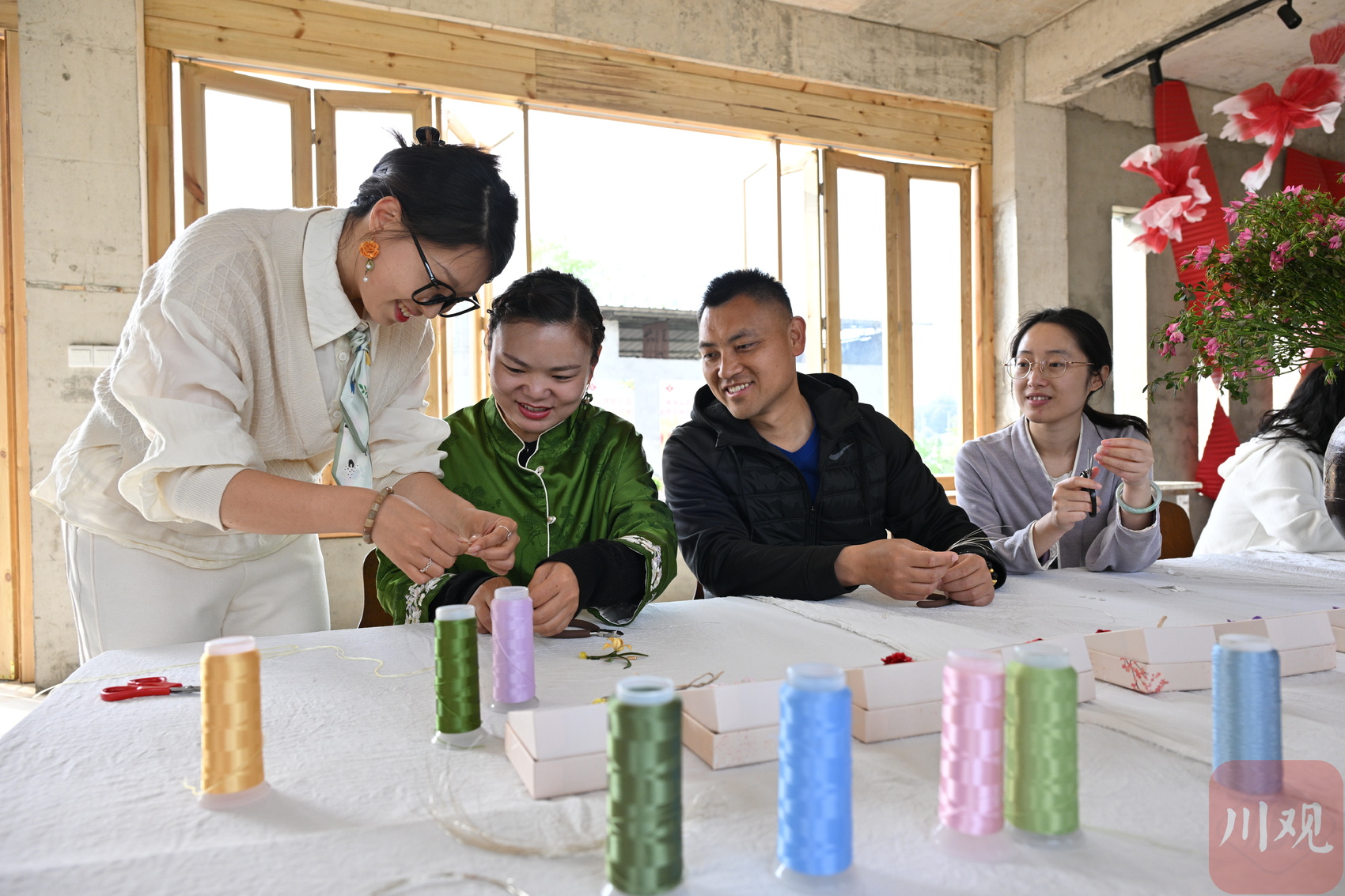 肖婷(左二)在村里引入缠花项目,助力乡村振兴。