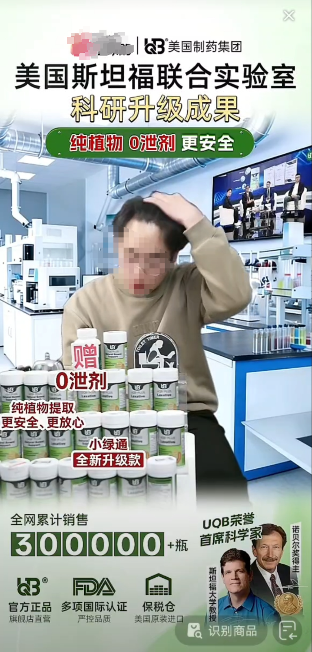 美国UQB品牌的直播间里,一款“小绿通”通便产品,宣称是美国制药集团产品,被美国政府列入监管。直播间反复播放诺贝尔奖得主、斯坦福大学教授的视频,大字标注“美国斯坦福联合实验室科研升级成果”。