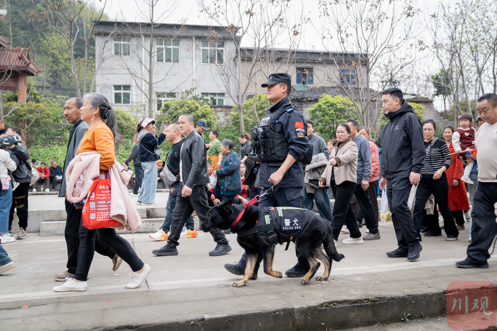 民警携警犬在活动现场及周围巡逻。