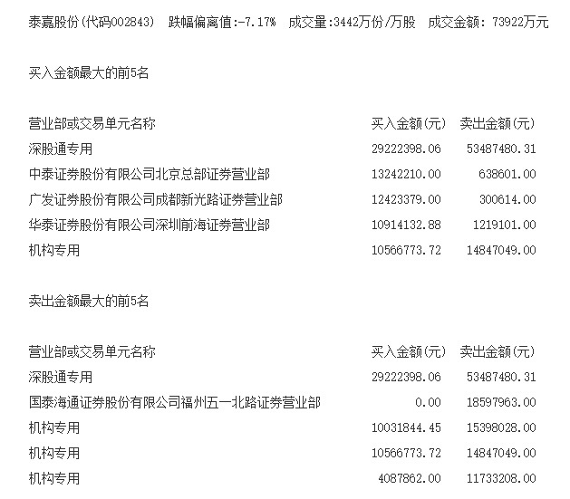 3月25日,泰嘉股份逆势回调,早盘明显低开后,股价继续震荡走低,最终跌幅超过5%。当日该股因跌幅偏离值达到7%出现在深交所交易公开信息当中。据披露,前五位卖出泰嘉股份的多来自机构和北上资金,其中三个机构专用席位合计卖出金额达到4196万元,北上资金则卖出高达5348万元。