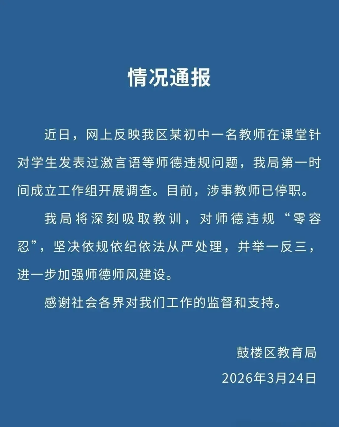24日上午,南京市鼓楼区教育局发布情况通报,近日,网上反映该区某初中一名教师在课堂针对学生发表过激言语等师德违规问题,该局第一时间成立工作组开展调查。目前,涉事教师已停职。