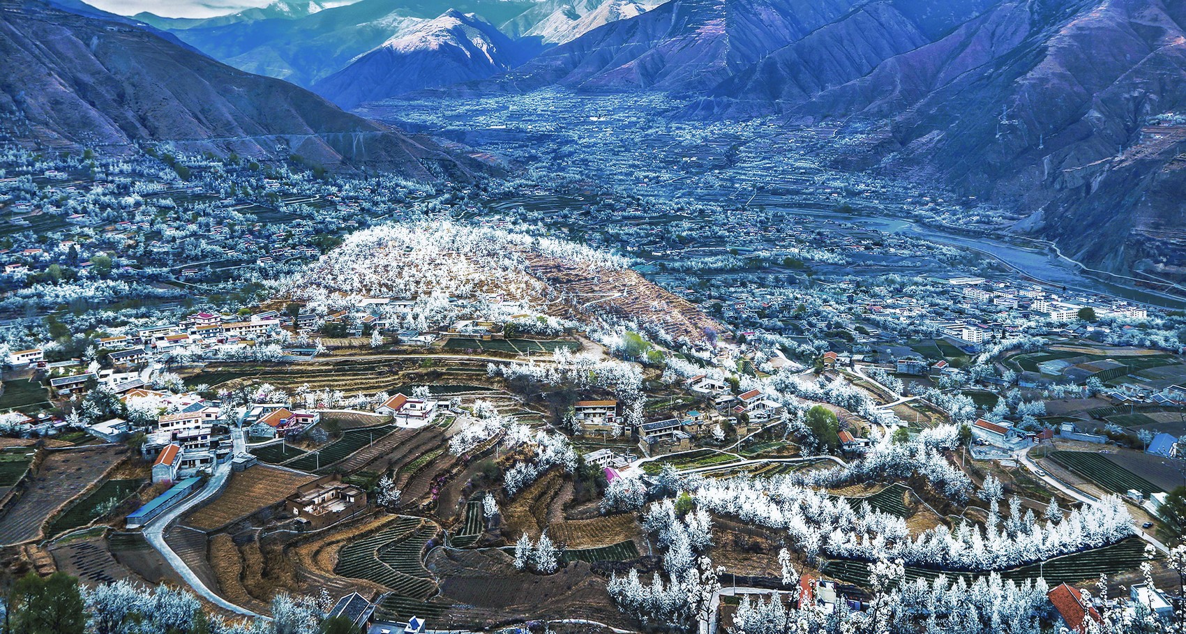 3月中旬,阿坝州金川县的大金川河谷一带,绵延的梨树进入盛花期,似雪梨花层层叠叠,当地特色民居镶嵌其间,川西高原版“千里江山图”跃然眼前。