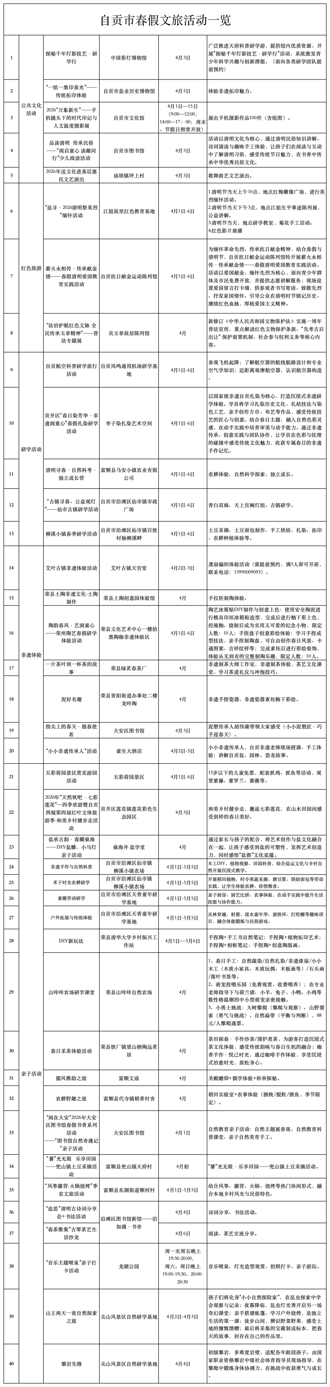 今年春假+清明期间,将有40项活动聚焦“文旅+体育”“文旅+非遗”“文旅+亲子”深度融合,为市民游客打造多样化、高品质的春日休闲体验。具体时间安排请看下图: