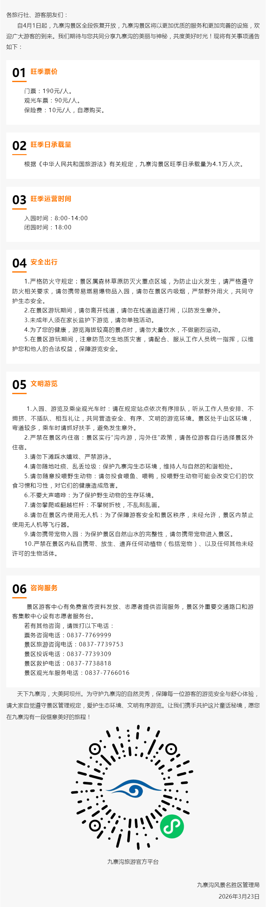 3月23日,九寨沟管理局发布通告,自4月1日起,九寨沟景区全段恢复开放,实行旺季旅游接待政策。具体如下: