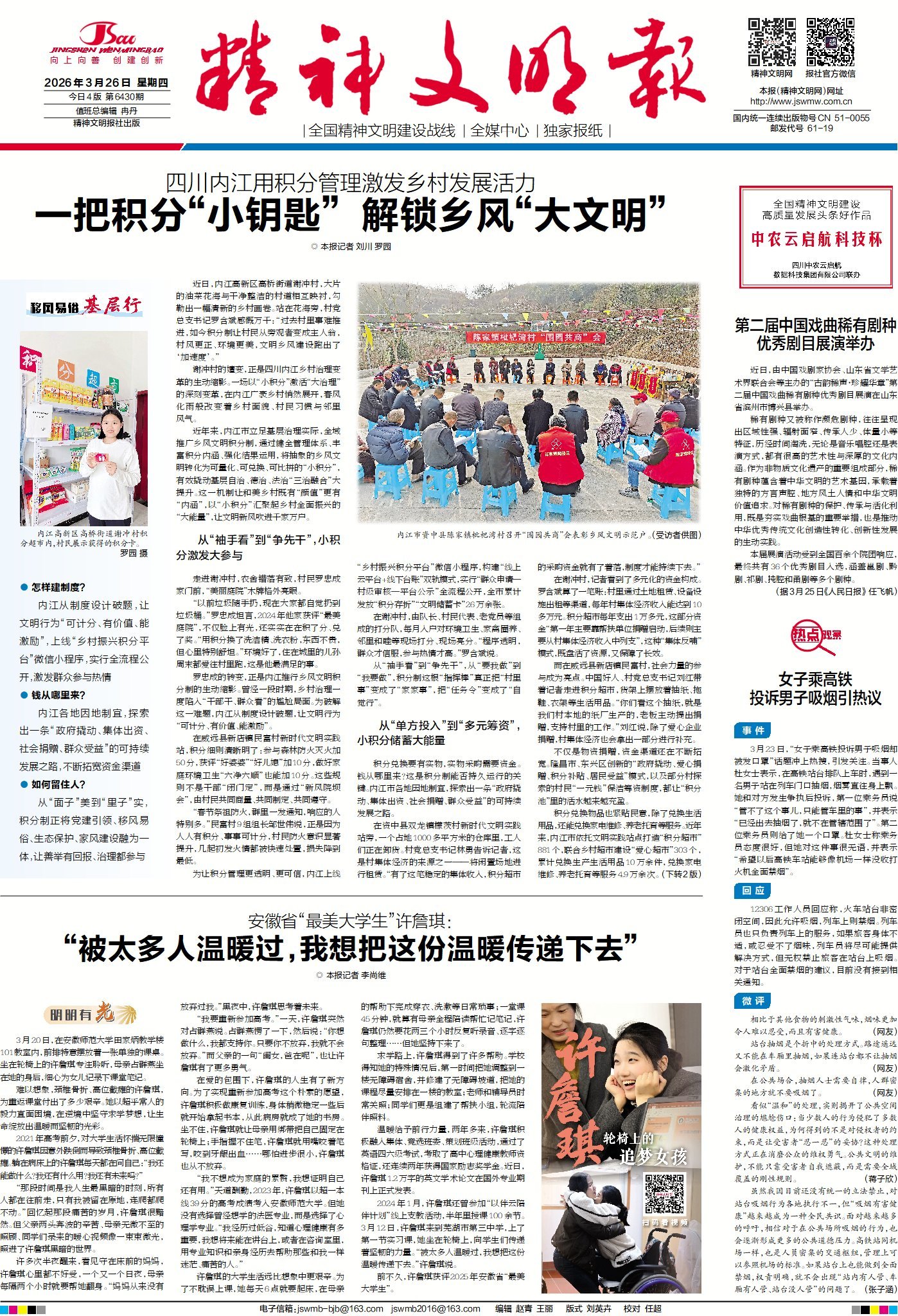 近年来,四川省内江市立足基层治理实际,全域推广乡风文明积分制,通过健全管理体系、丰富积分内涵、强化结果运用,将抽象的乡风文明转化为可量化、可兑换、可比拼的“小积分”,有效撬动基层自治、德治、法治“三治融合”大提升。请关注今日1版《移风易俗基层行》栏目,看内江如何用一把积分“小钥匙”解锁乡风“大文明”。