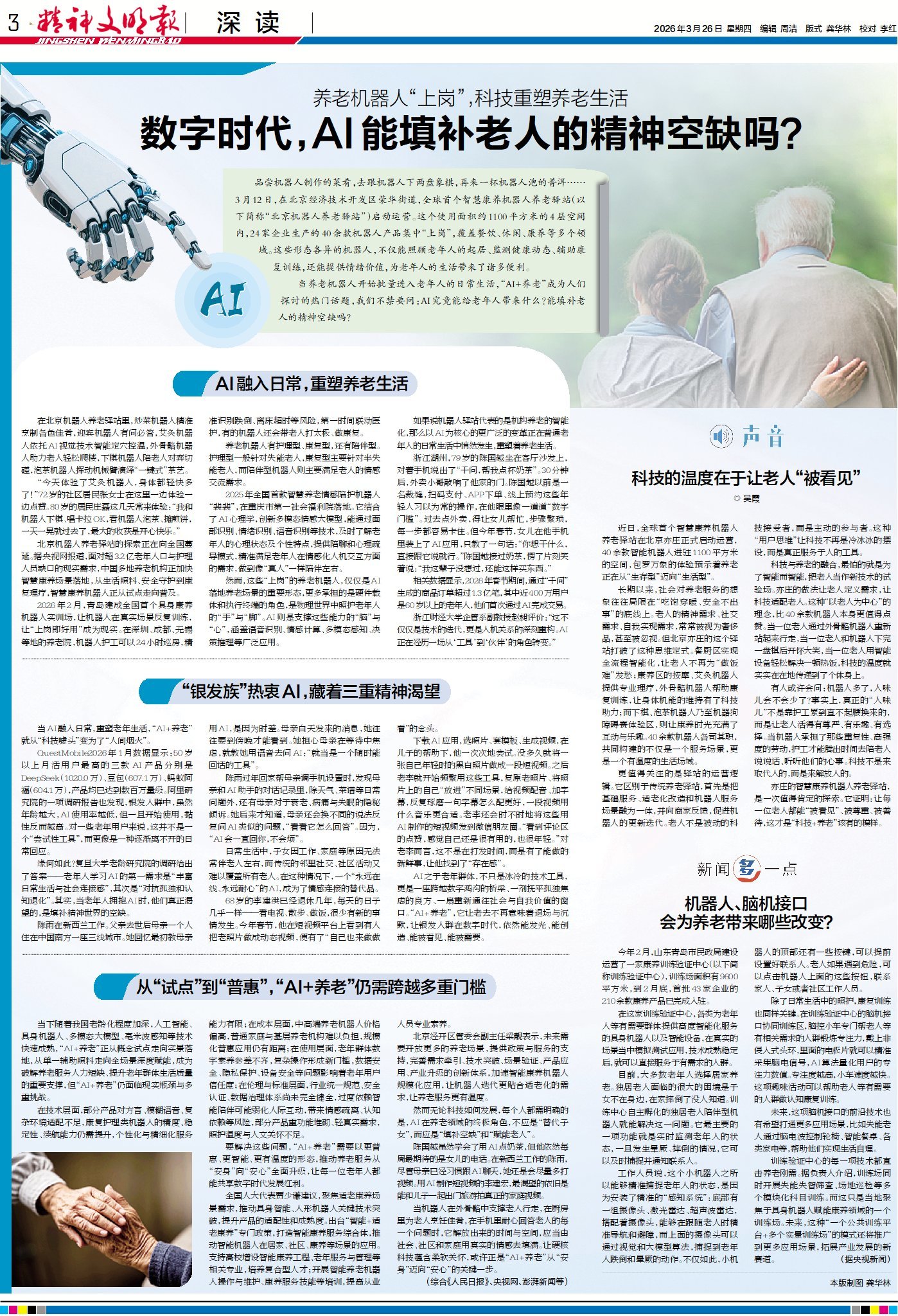 从北京智慧康养机器人驿站的全场景落地,到情感陪护机器人的暖心对话,再到AI助力跨越数字鸿沟、重拾生活乐趣,一场AI为核心的养老变革正在悄然进入老年人的日常。当养老机器人开始批量进入老年人的日常生活,“AI+养老”成为人们探讨的热门话题,我们不禁要问:AI究竟能给老年人带来什么?能填补老人的精神空缺吗?来今日3版“深读”,解锁“AI+养老”的新图景,一同探寻数字时代的温情养老之道。