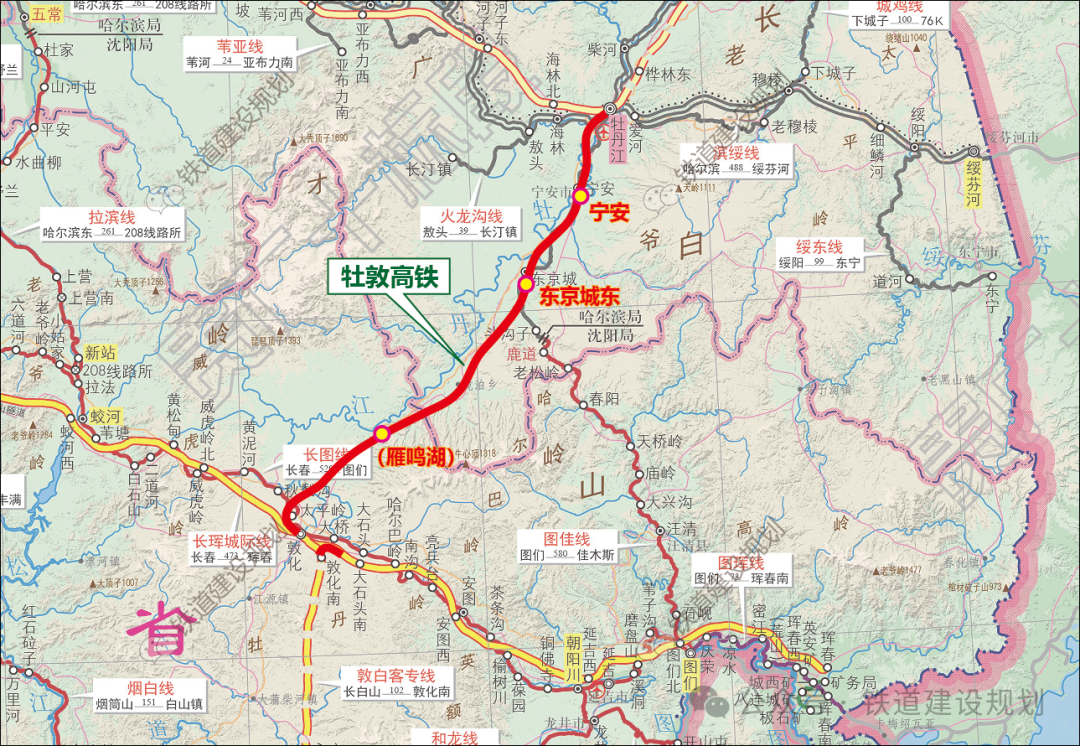 根据可研方案,全线设车站5座,其中新建雁鸣湖、东京城东2座车站,改建敦化、宁安2座车站,利用既有牡丹江1座车站;雁鸣湖为越行站,预留客运条件。同步建设:敦化地区新建长白山至延吉方向联络线;东京城地区普速外迁工程;牡丹江动车所增建8条存车线。全线建设总工期为4.5年。