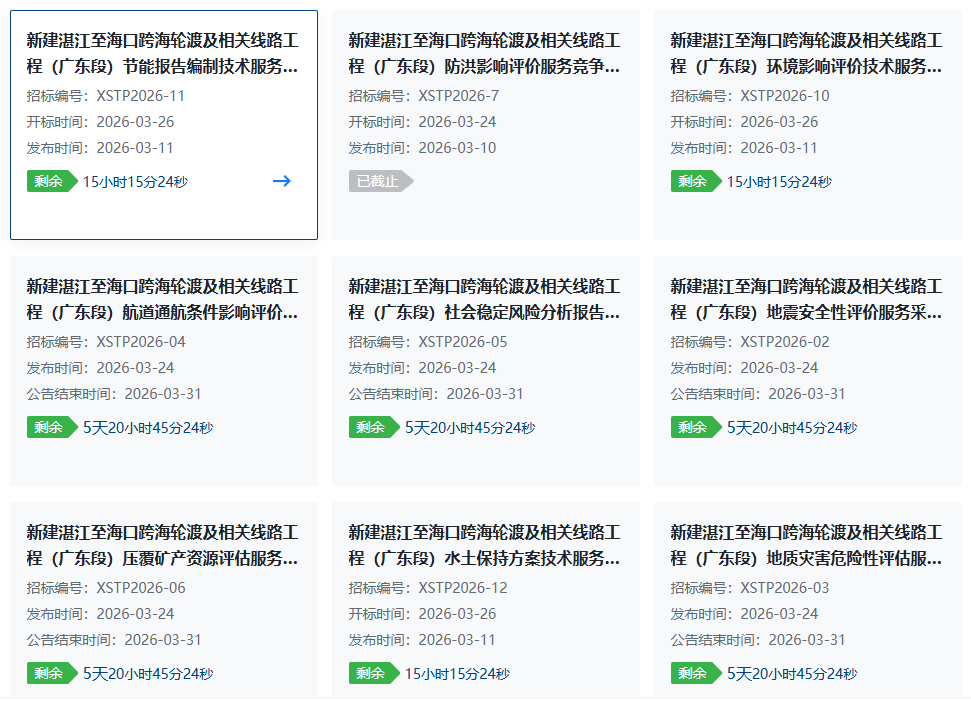 3月24日,新建湛江至海口跨海轮渡及相关线路工程(广东段)航道通航条件影响评价、社会稳定风险分析报告、地震安全性评价、压覆矿产资源评估、地质灾害评估服务等5项采购成交候选人公示发布,项目初步设计批复要件编制工作即将全面展开。