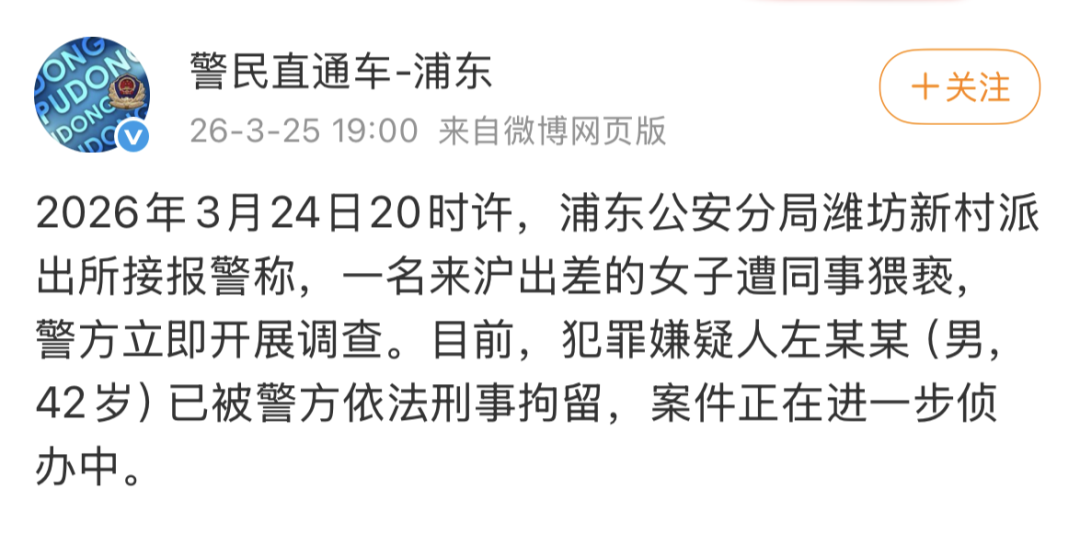 2026年3月24日20时许,浦东公安分局潍坊新村派出所接报警称,一名来沪出差的女子遭同事猥亵,警方立即开展调查。目前,犯罪嫌疑人左某某(男,42岁)已被警方依法刑事拘留,案件正在进一步侦办中。