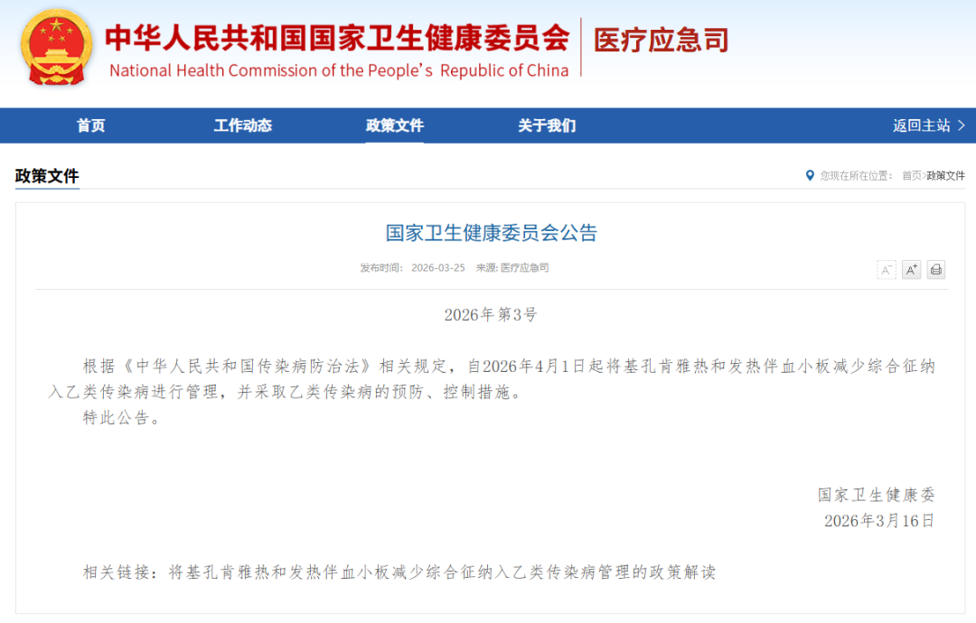 国家卫生健康委今天发布公告,根据《中华人民共和国传染病防治法》相关规定,自2026年4月1日起将基孔肯雅热和发热伴血小板减少综合征纳入乙类传染病进行管理,并采取乙类传染病的预防、控制措施。