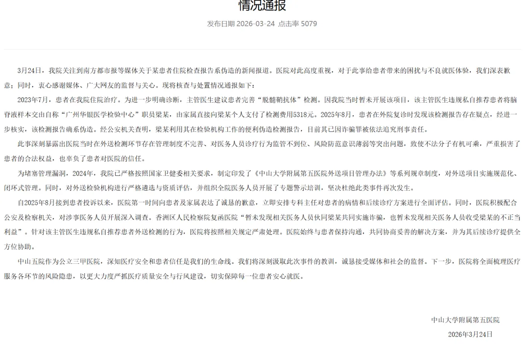 中山五院作为公立三甲医院,深知医疗安全和患者信任是我们的生命线。我们将深刻汲取此次事件的教训,诚恳接受媒体和社会的监督。下一步,医院将全面梳理医疗服务各环节的风险隐患,以更大力度严抓医疗质量安全与行风建设,切实保障每一位患者安心就医。