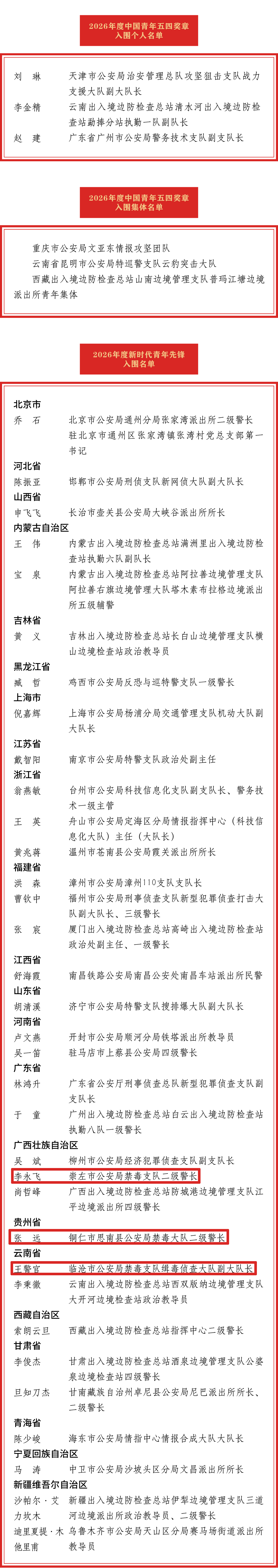 3月22日,2026年度中国青年五四奖章暨新时代青年先锋奖入围公示,其中公安系统37名个人和3个集体入围。其中,广西壮族自治区崇左市公安局禁毒支队二级警长李永飞、贵州省铜仁市思南县公安局禁毒大队二级警长张远、云南省临沧市公安局禁毒支队缉毒侦查大队副大队长王警官名列2026年度新时代青年先锋入围名单。